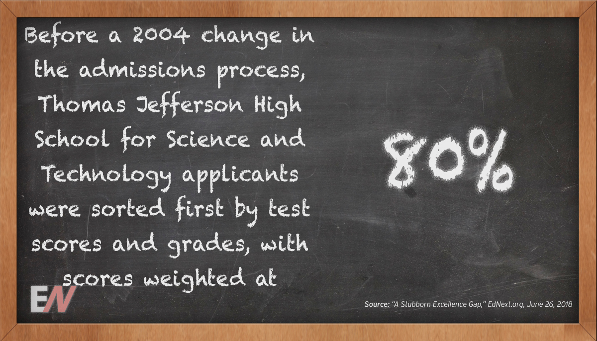 EdStat: Before a change in the admissions process, TJ applicants were sorted first by test scores and grades, with scores weighted at 80% – by Education Next