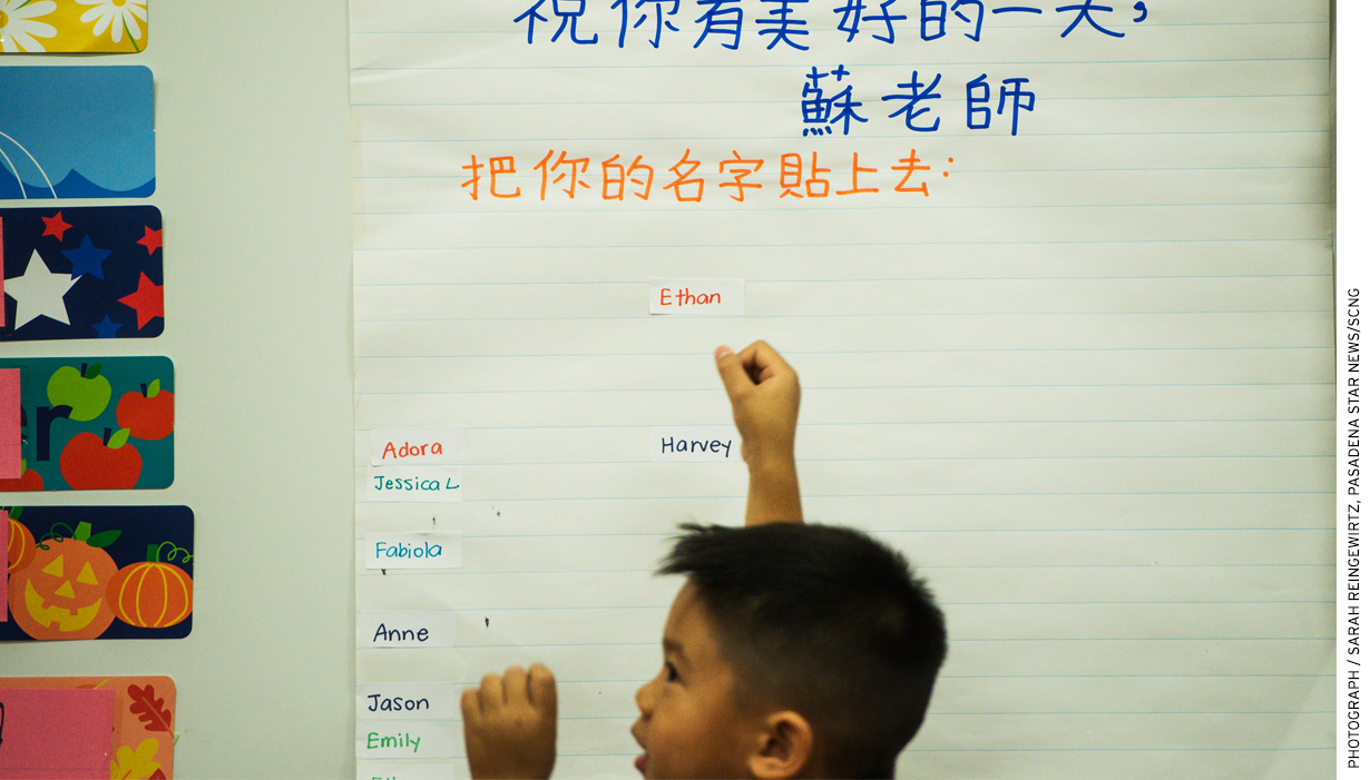 In Rowland Heights, Calif., Ethan Heng, 5, adds his name to a board that reads in Mandarin, “We can recognize our English names.”