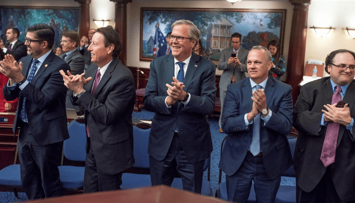 Former Florida Gov. Jeb Bush, center, applauds on the floor of the Florida House of Representatives after the passage of the Family Empowerment Scholarship program.