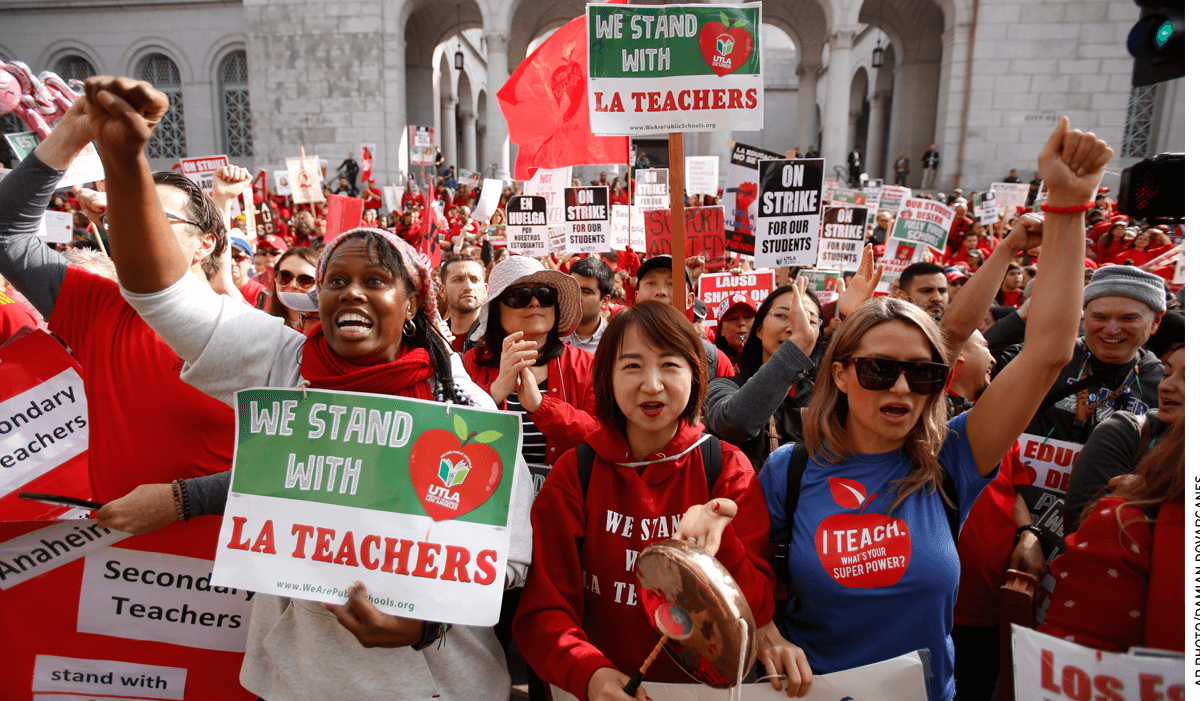 Teachers, parents and students picket outside City Hall in Los Angeles, Friday, Jan. 18, 2019, as part of a strike against Los Angeles Unified School District.