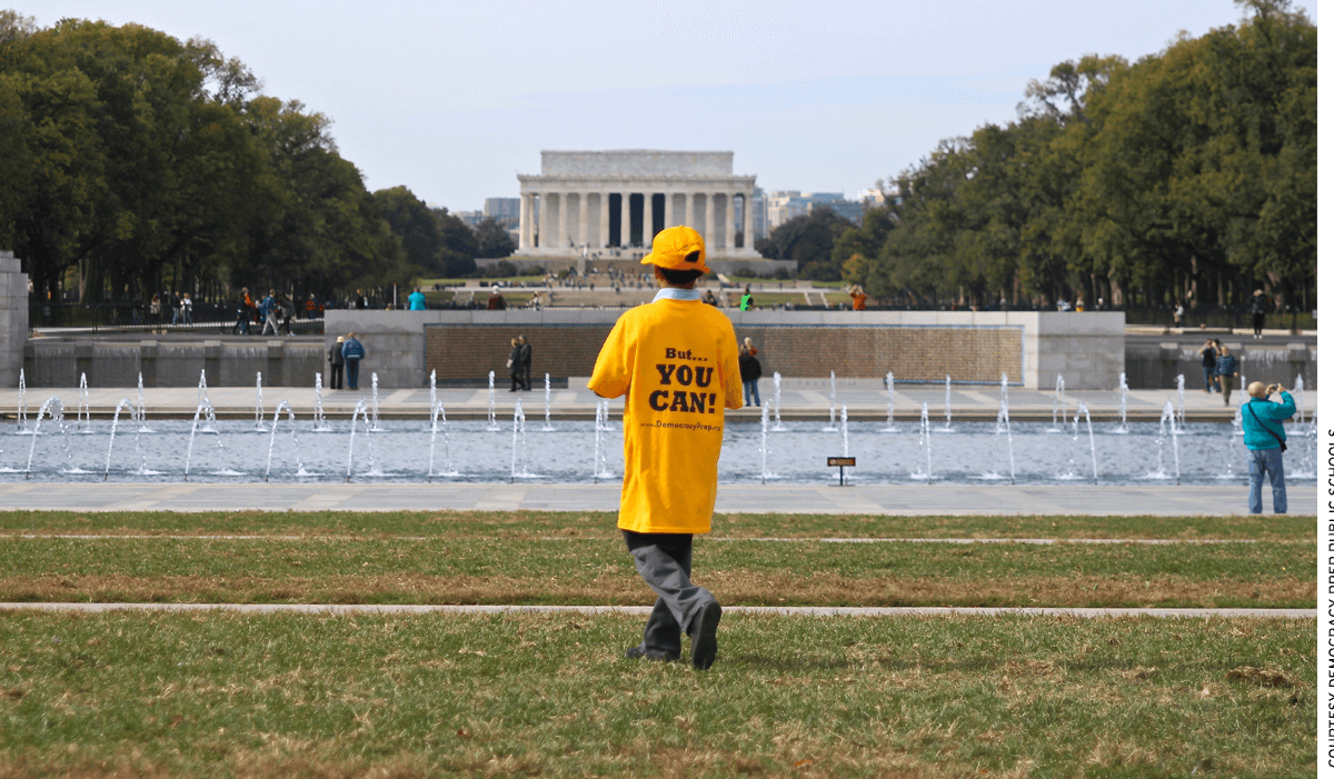 At Democracy Prep, students are known as “citizen-scholars” and schools follow the motto: “Work Hard. Go to College. Change the World!” The network encourages civic behavior through a variety of curricular and experiential means, including by having students visit legislators, attend public meetings, testify before legislative bodies, and discuss influential essays on civics and government in class. On Election Day each year, students participate in “Get Out the Vote” campaigns and canvass busy street corners wearing “I Can’t Vote, but You Can!” T-shirts. As high-school seniors, they enroll in a capstone course in which they develop a “Change the World” project to investigate a real-world social problem, design a method for addressing the issue, and implement their plan.