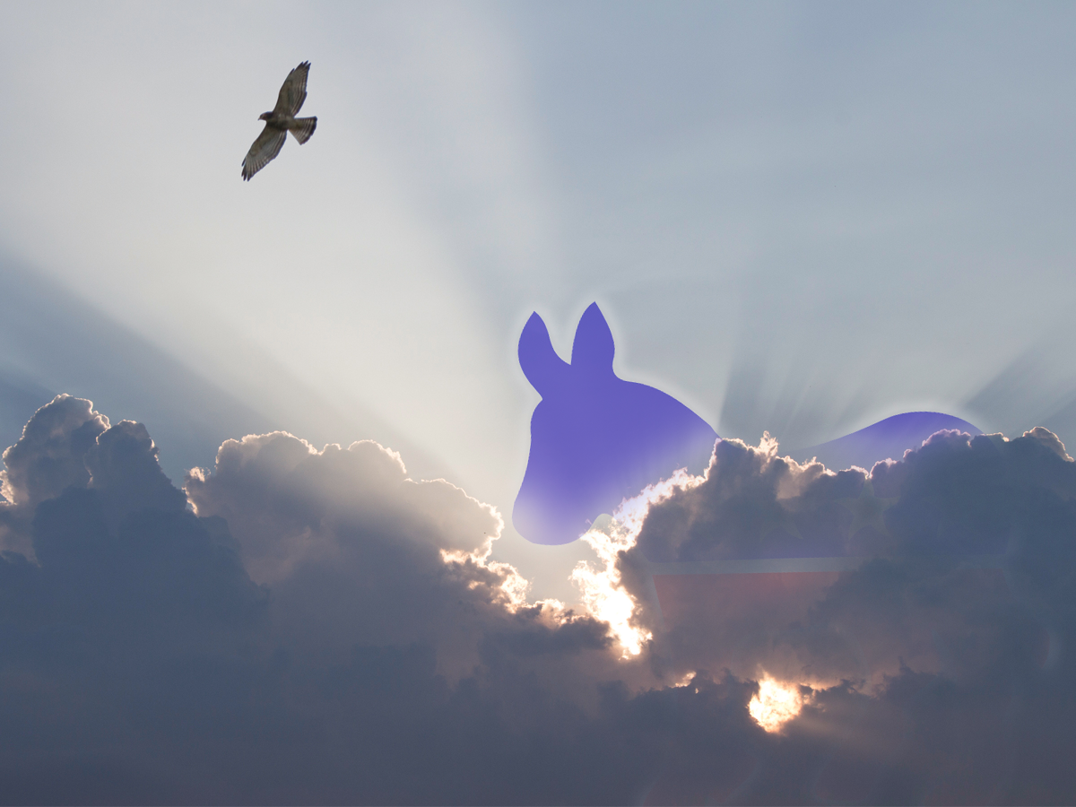 The Democrat's donkey logo peeks out from behind the clouds