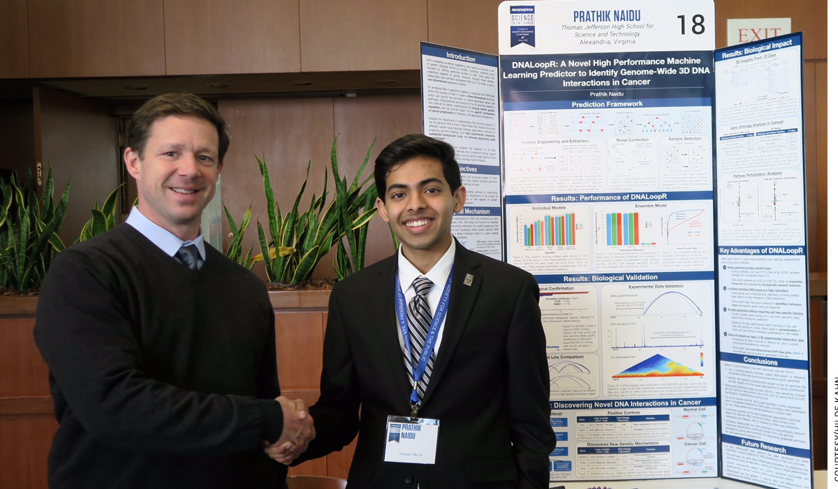 TJ student Prathik Naidu (right) was a finalist in last year’s Regeneron Science Talent Search, the nation’s oldest and most prestigious science and math competition for high school seniors. Dr. Brian Kennedy (left), director of TJ’s Chemical Analysis and Nanochemistry Research Laboratory, is the school’s coordinator for Regeneron.