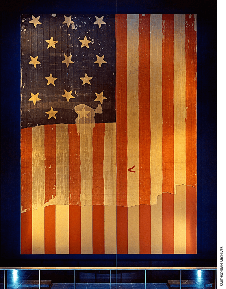 The original Star-Spangled Banner, which flew over Fort McHenry in 1814 and inspired the words of our National Anthem, as it was displayed in what is now the National Museum of American History.