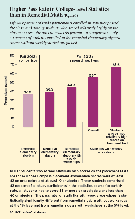 By the end of Spring 2015, three semesters after the experiment’s end, just 37 percent of remedial elementary algebra students had passed a college-level quantitative class, which is required for graduation, compared to 60 percent of students placed directly into statistics. Statistics students had also accumulated roughly five more college credits than students in remedial algebra without workshops (a gap that had grown larger after each semester, indicating that it was not just due to the credits earned in the original statistics course).