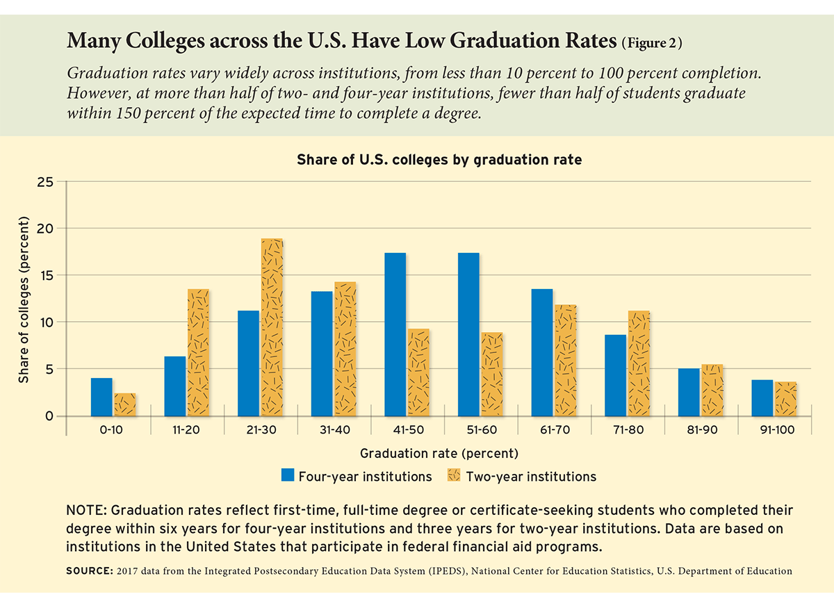 What can policymakers do? First, they can ensure that the accrediting agencies that function as the gatekeepers for federal funding are looking at student outcomes. If a school isn’t providing a real return on investment to students, and if most of its students are leaving without a degree, that school should not continue to be accredited. Second, in the reauthorization of the Higher Education Act, Congress can mandate that if a school fails to graduate a specified percentage of its students within eight years, it will lose eligibility for federal grant and loan dollars. And third, the government can invest in the schools that actually do want to improve their outcomes, by funding the expansion of evidence-based programs to increase completion rates—particularly for low-income students and students of color. Together, these three simple steps would send a powerful message to the higher-education system: make sure that more students get the degree they need to set them up for success in the future.