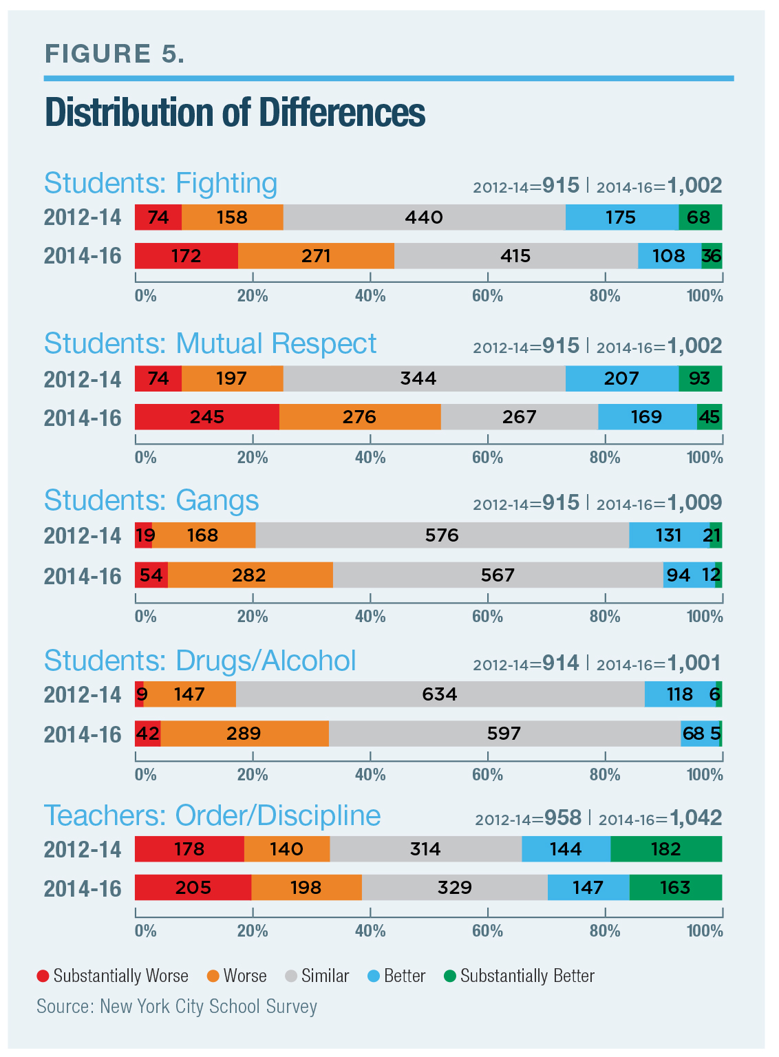 To calculate shifts in school climate, I examined and displayed school-level changes in each period to the percentage of negative responses (e.g., teachers who “disagree” or “strongly disagree” when asked if order and discipline are maintained). I display those changes using a distribution of differences, stipulating that a change of less than five percentage points represents no shift, a change of five to fifteen represents a shift, and a change of 15+ represents a substantial shift. (Elementary schools are excluded from the analysis, as NYC DOE does not survey elementary school students.)