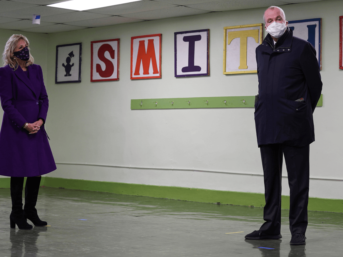 First Lady Jill Biden tours a cafeteria at the Samuel Smith Elementary School in Burlington, N.J., with New Jersey Gov. Phil Murphy on Monday, March 15, 2021. Gov. Murphy has said that school districts in his state won’t be allowed to offer virtual learning next year.