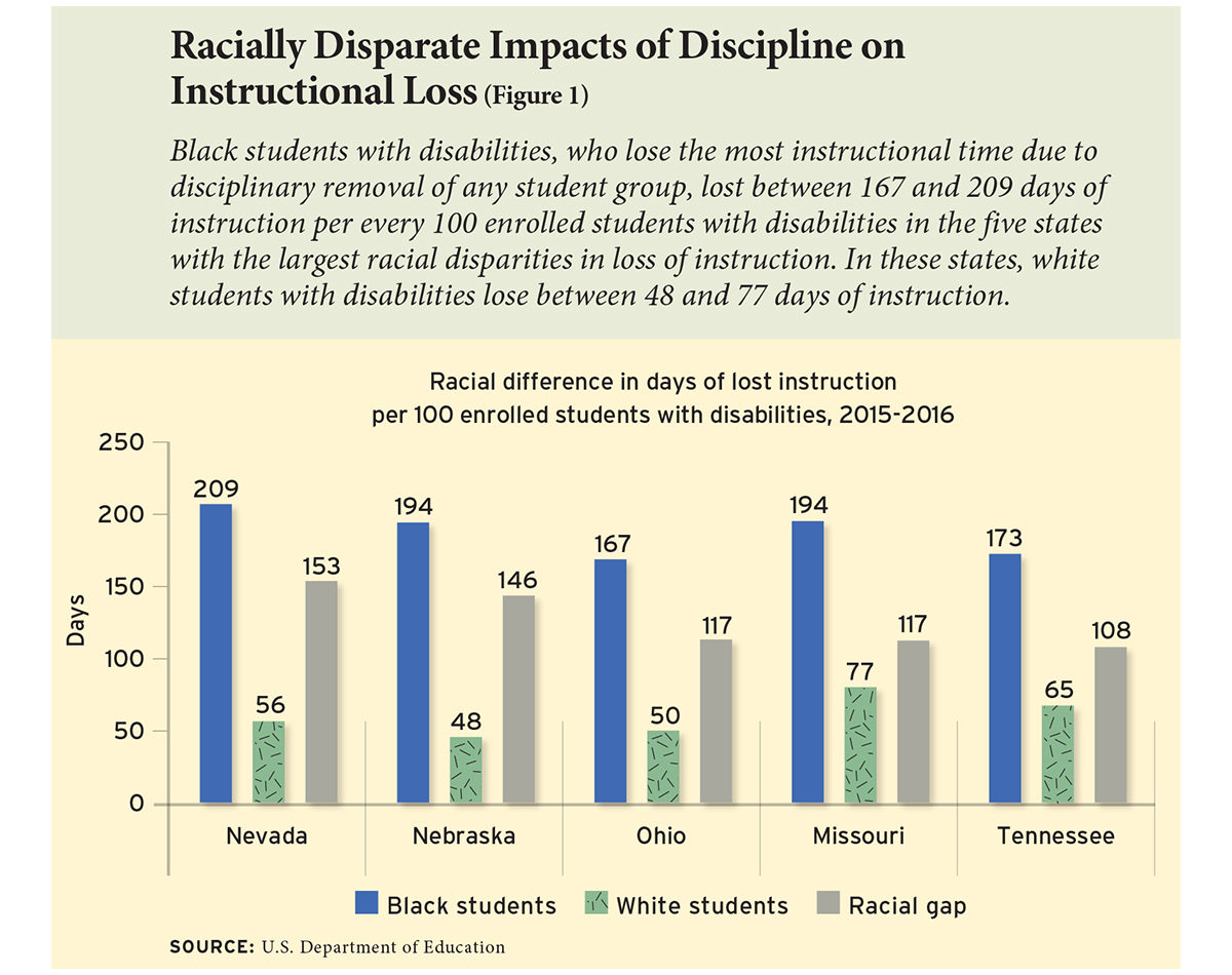 What is truly alarming are the racially disparate impacts on instructional loss caused by discriminatory discipline policies and practices. Students with disabilities are more likely than their peers to be suspended overall; but again, we find major differences in suspension rates by students’ race. Recently, I shared distressing new findings from a soon-to-be-published Civil Rights Project report on federal school-discipline data, which show the impact on black students with disabilities, who lose the most instructional time due to disciplinary removal of any student group (see Figure 1). Based on federal data from 2015-16 (two years after the guidance was disseminated), the Civil Rights Project estimates conservatively that due to disciplinary removals, black students with disabilities lost 113.3 days of instruction per every 100 black students with disabilities enrolled nationwide. By comparison, white students with disabilities lost an estimated 39.5 days of instruction per 100 students. Many states had much larger differences. Even more pronounced differences in lost instruction due to discipline are found at the district and school levels.