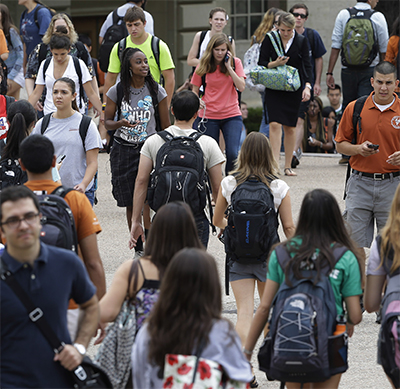 Students walk through the campus of the University of Texas at Austin. (Photo by Eric Gay/Corbis Images)