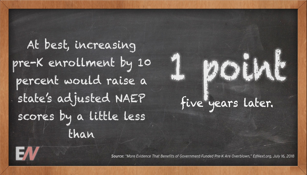 EdStat: At Best, Increasing Pre-K Enrollment by 10 Percent Would Raise a State’s Standard Adjusted NAEP Score by a Little Less Than 1 Point Five Years Later – by Education Next