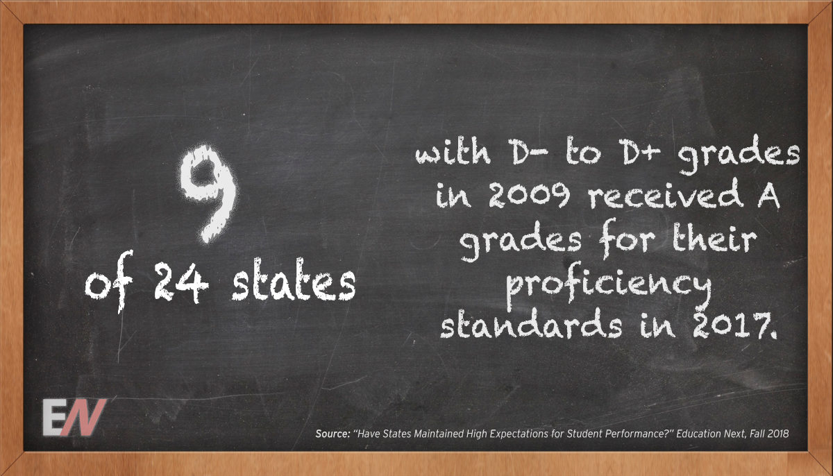 For more than a decade, researchers at Education Next have graded state proficiency standards on an A–F scale. When the Common Core initiative began in 2009, not a single state had achieved, by today’s standards, an A for having a proficiency bar tightly aligned with NAEP. Since then, a number of states have made particularly dramatic improvements, and nine of 24 states with D- to D+ grades in 2009 received A grades in 2017.