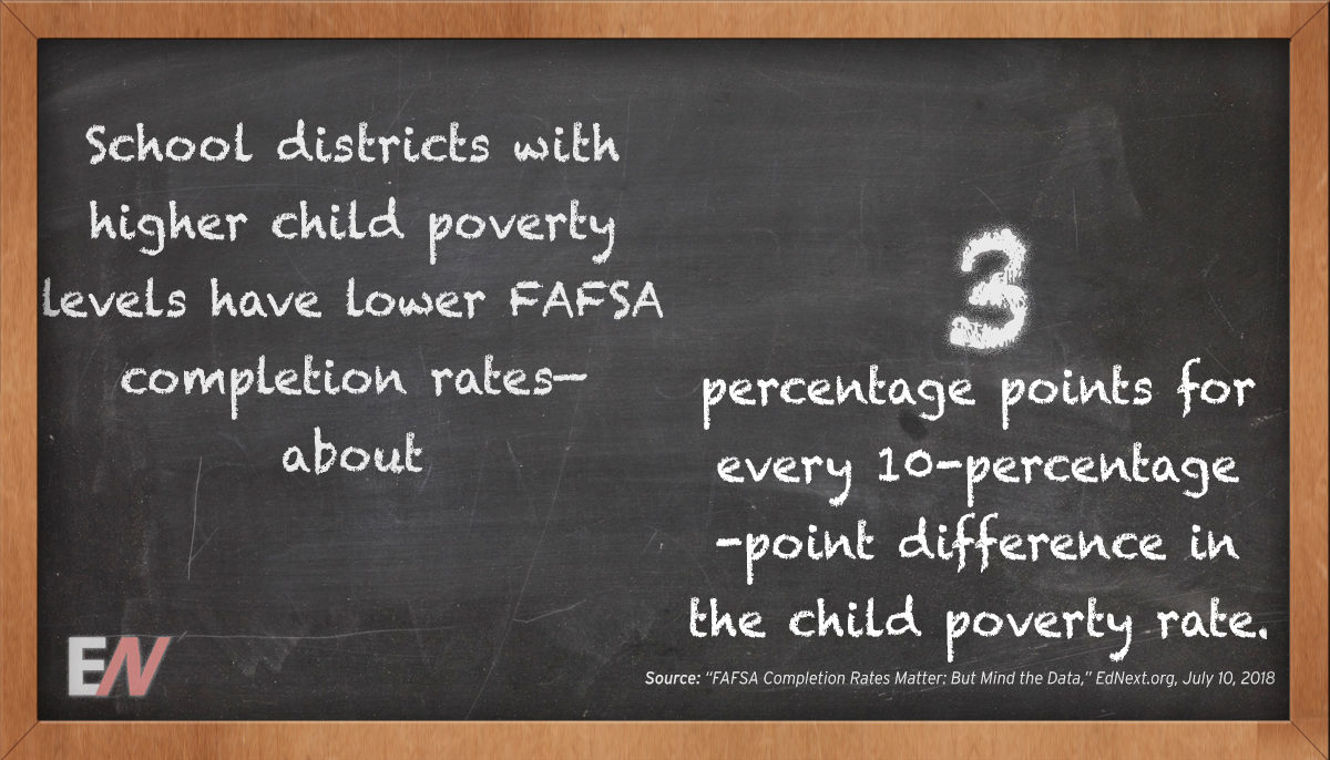 FAFSA season has just ended. This year, as every year, many students who are eligible for aid will have failed to complete the form. One might think that Free Application for Federal Student Aid (FAFSA) completion rates would be highest in school districts with the greatest need, but a recent National College Access Network (NCAN) study found that school districts with higher child poverty levels have lower FAFSA completion rates—in the realm of 3 percentage points for every 10-percentage-point difference in the child poverty rate. To learn more, read “FAFSA Completion Rates Matter: But Mind the Data” on the EdNext.org blog.
