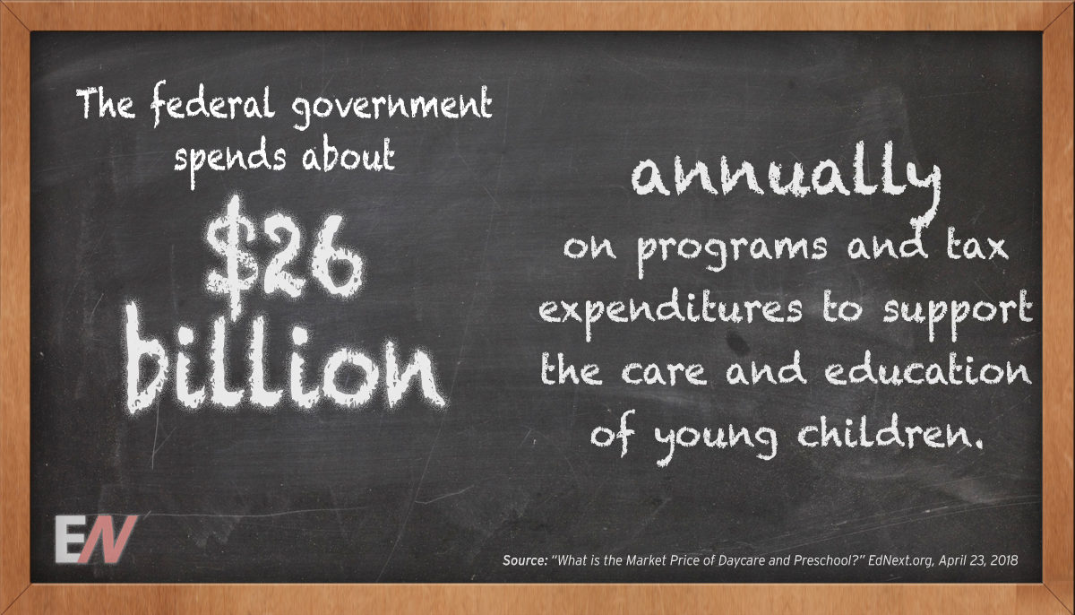 How much are individual households spending to send a child to a center-based program—in other words, what is the market price of child care? This can be difficult to determine, because the government intervenes in numerous ways. The federal government, for example, spends about $26 billion annually on programs and tax expenditures to support the care and education of young children. Some states and cities have also assumed substantial costs to provide free public preschool programs. Information on market price is useful, however, because it can inform decisions by states or localities on how to set sliding fee schedules or eligibility cutoffs so as to focus state expenditures on the families in greatest financial need, while not at the same time driving away families with higher incomes whose children can provide needed socioeconomic diversity in daycare and preschool centers. To learn more about the market price of daycare and preschool, read Russ Whitehurst’s full article on EdNext.org. To see how charter schools are expanding to better serve preschool students, check out “The Charter Model Goes to Preschool” from our Winter 2017 issue.