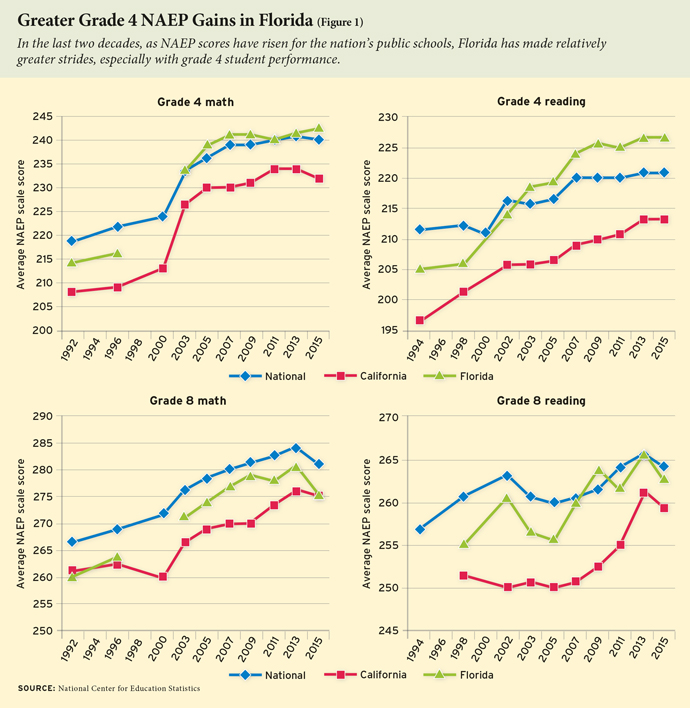 A bold, new direction was required. And so in 1999, we overhauled our school system through accountability legislation that made student learning the focus of education. We adopted an accountability formula based on students’ academic performance, requiring schools to focus resources on elevating achievement. Our letter-grade system gave parents a ready tool to assess school quality and make informed choices for their children. And even as the statewide Florida Education Association vehemently opposed these reforms, our students went on to become national leaders in making progress on NAEP (see Figure 1).