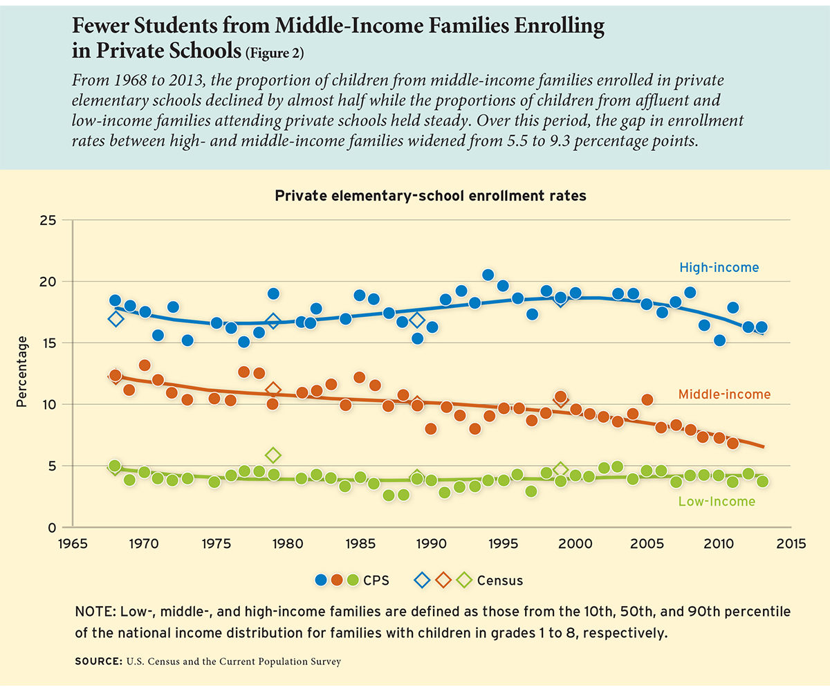 Much of the decline among middle-income students is due to falling enrollment at Catholic schools, which have closed in droves in the past 20 years. Meanwhile, private-school enrollment among affluent students has shifted from religious to nonsectarian schools.