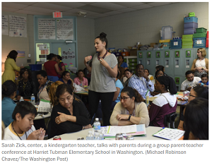 In hundreds of schools in the District and elsewhere, these conferences look drastically different as educators seek to build stronger relationships with parents and equip families with tools to reinforce classroom concepts at home. Teachers and parents meet in a large group setting at least three times a year, sometimes with students present. They discuss how students are performing on key measures such as reading comprehension and mastery of math concepts. Parents leave the meetings with games and other activities they can use at home to reinforce classroom learning.