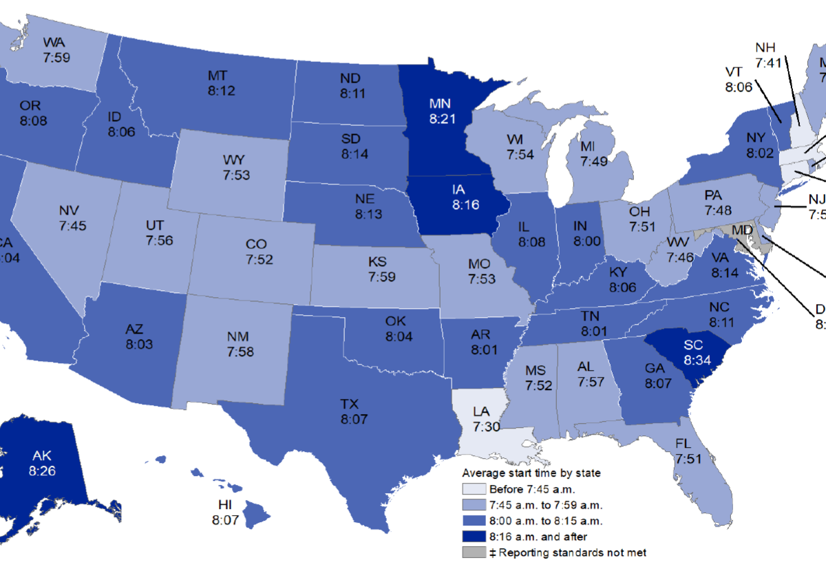 “The average high school starting time in all other states fell between 7:45 a.m. and 8:15 a.m,” says the NCES data point, authored by Holly Sawyer and Soheyla Taie of Westat.
