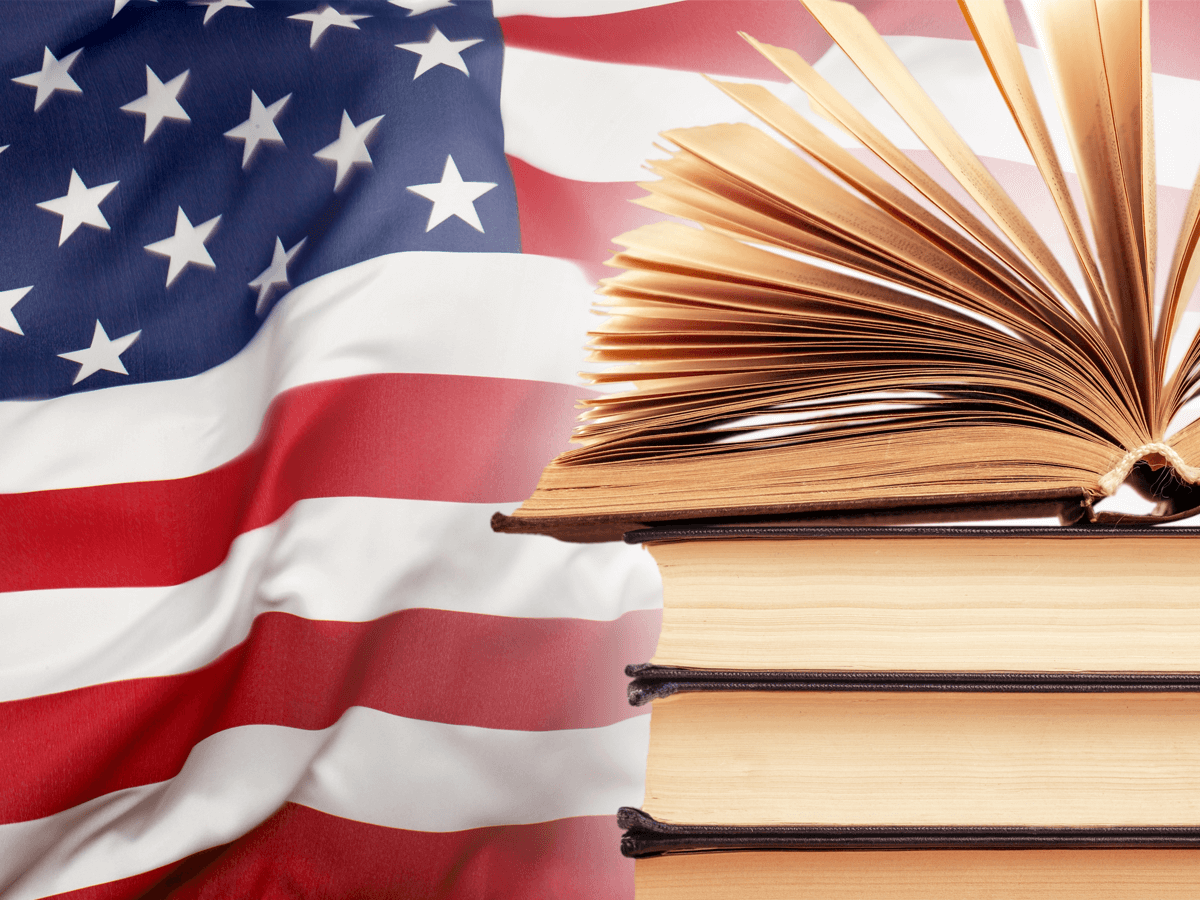 Stack of textbooks with American flag in the background
