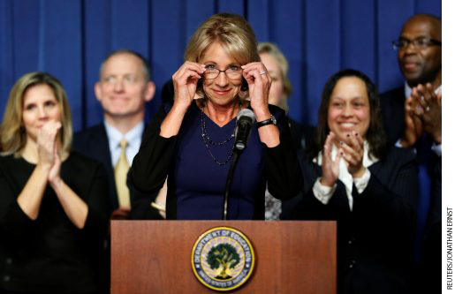 US Education Secretary Betsy DeVos concludes her remarks to Education Department staff on her first day on the job in Washington, February 8, 2017.