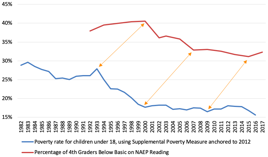 What immediately jumps out from this picture are the similar inflection points in both lines—with changes in the “below basic” rate lagging changes in the child poverty rate by about seven years. From 1993 until 2000, the supplemental child poverty rate declined from 28 percent to 18 percent—a 10-point drop, or 36 percent reduction. From 2000 until 2007, the percentage of fourth graders reading below basic on NAEP declined from 41 percent to 33 percent—an 8-point fall, or 20 percent reduction. The supplemental child poverty rate hit an all-time low in 2009, before ticking up in 2010. And the below-basic rate hit an all-time low in 2015, before ticking up in 2017.