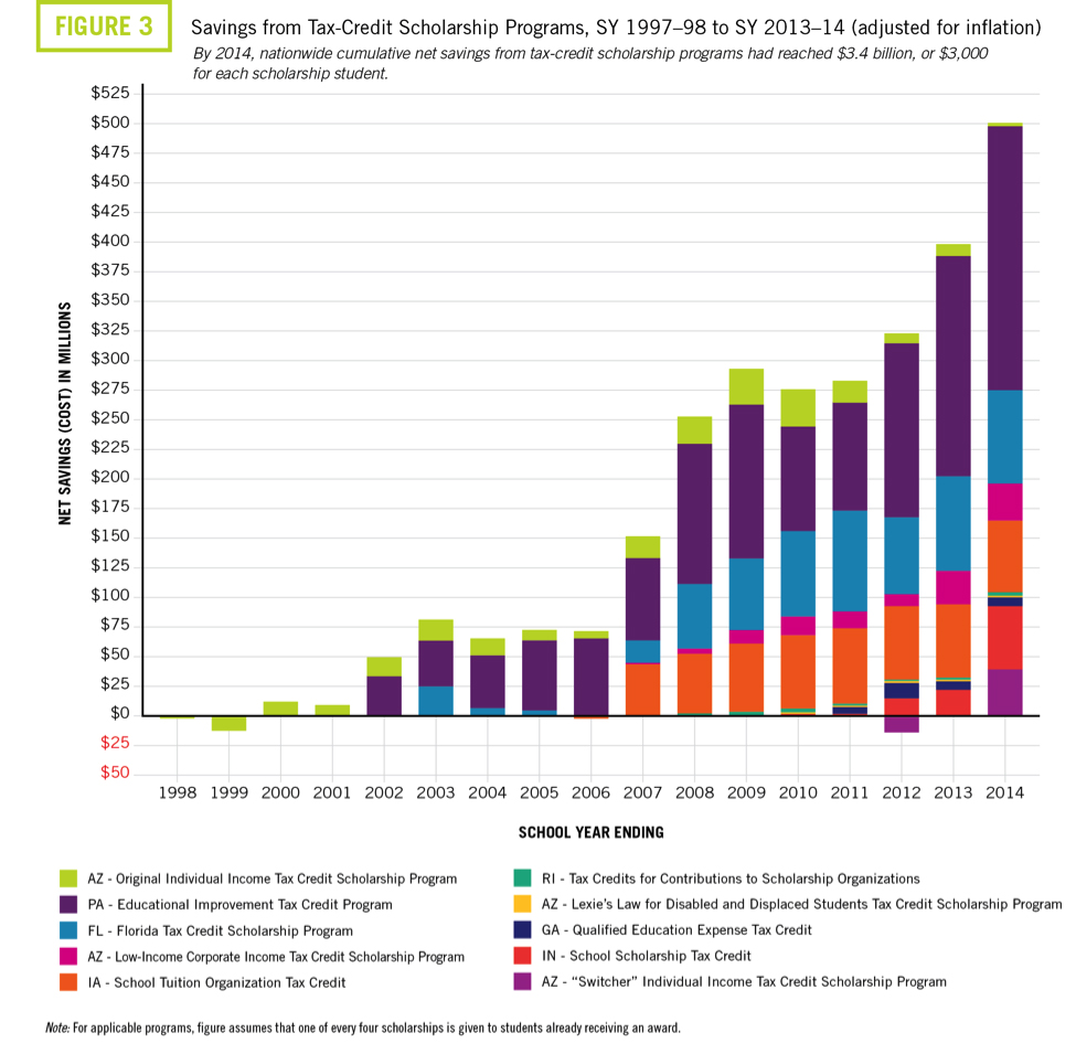 The AASA/ITEP report also claims that TCS policies “divert over $1 billion per year toward private schools” instead of public treasuries and district schools. Setting aside that this is less than 0.16 percent of the more than $625 billion spent annually on public education nationwide, the report tells only half the story. It’s true that tax-credit scholarships reduce state revenue, but they also reduce state expenditures on K-12 education. Focusing exclusively on one side of the balance sheet is a highly misleading tactic we’re used to seeing from those who’d rather pump money into a system than have it follow individual students.