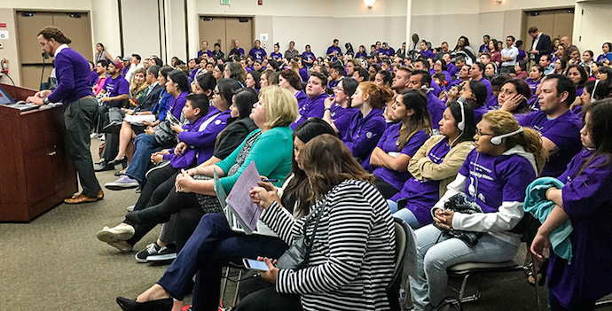 Over 250 parents of Rocketship Mosaic Elementary crowd into a standing room only reauthorization hearing in February 2016 to demand their school stays open another 5 years