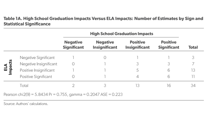 We also find significant alignment for individual programs. The impacts on ELA achievement and high school graduation point in the same direction in seventeen out of twenty-two studies, or 77 percent of the time. For math, it’s thirteen out of twenty studies, or 65 percent. For college enrollment, the results point in the same direction 100 percent of the time.