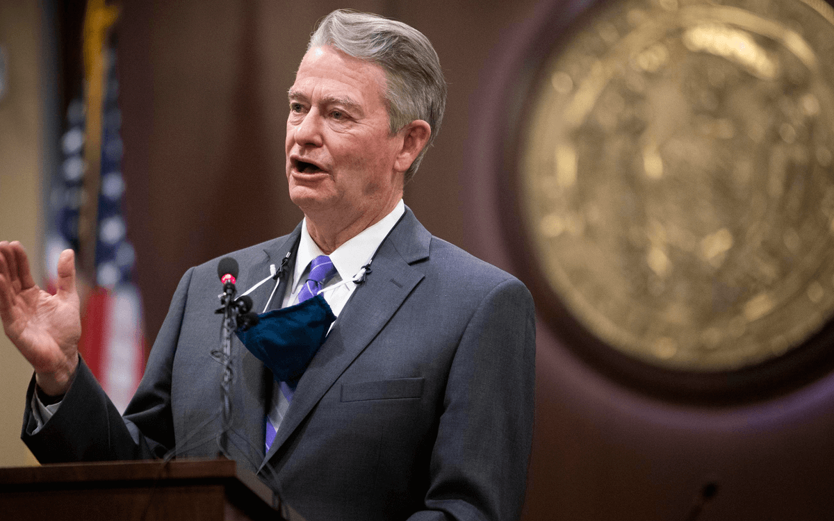 Idaho Governor Brad Little speaking at a podium