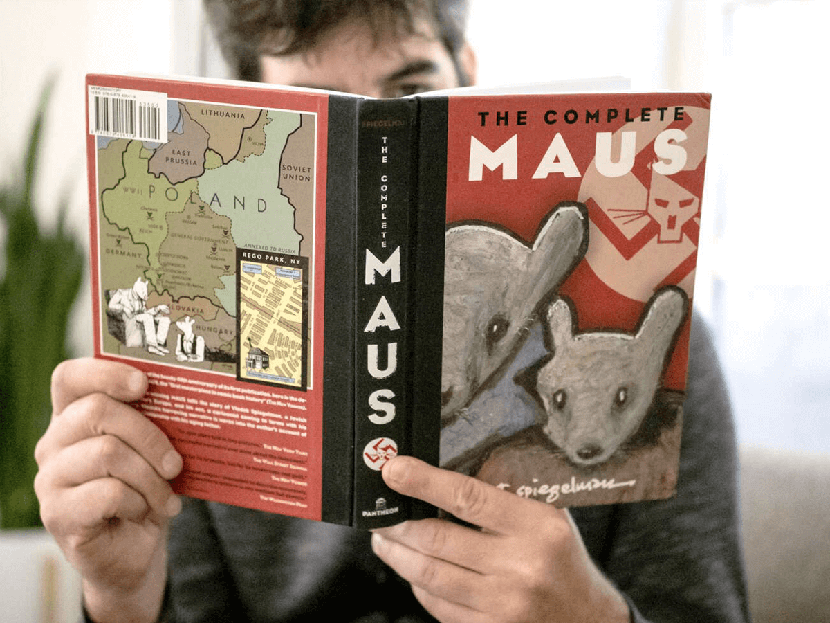 A man reads a copy of Maus by Art Spiegelman