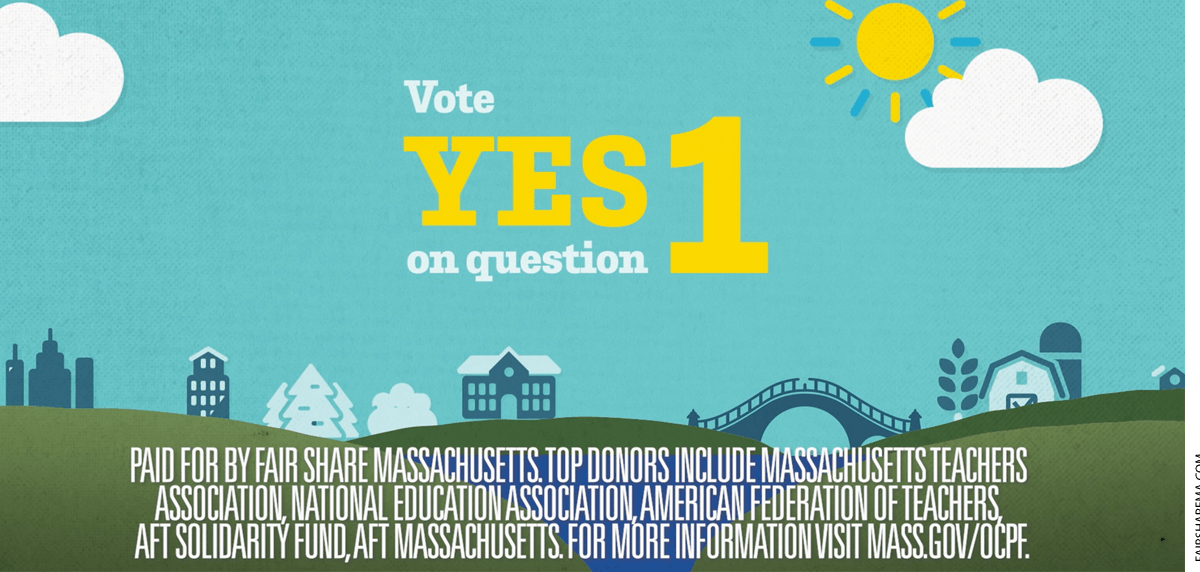 The voter information distributed by the state describes the initiative as backed by a group called Fair Share Massachusetts. But as the fine print down at the bottom of the Fair Share Massachusetts web site indicates, Fair Share Massachusetts is a front organization for the teachers unions. “Top donors include Massachusetts Teachers Association, National Education Association, American Federation of Teachers, AFT Solidarity Fund, AFT Massachusetts,” the language says.