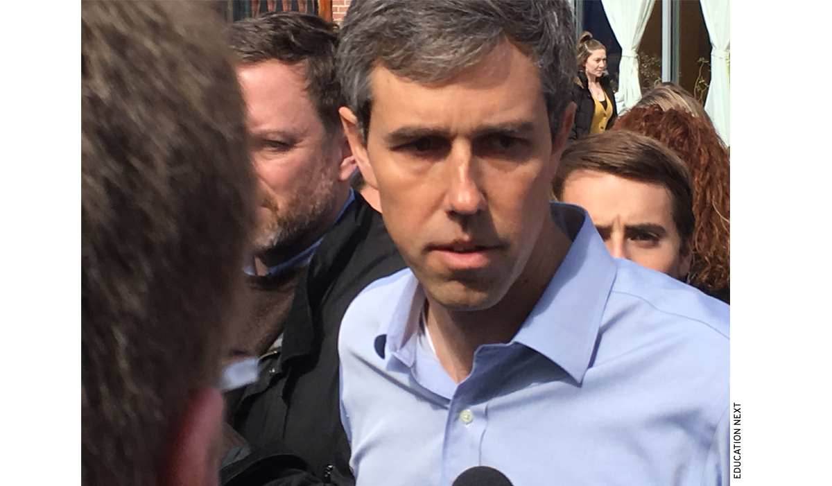 O’Rourke said his own three children go to “world-class public schools” where they learn math in both English and Spanish. He said he wanted to “move the starting line back” by assuring every 4-year-old access to pre-kindergarten, and also to “make cost no barrier to advancement after high school.”