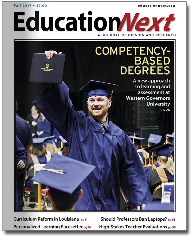 The Fall 2017 cover article details how Western Governors University pioneered a competency-based approach to higher education through the use of pre- and post-assessments that students take at their own pace to demonstrate mastery of a given subject. Meanwhile, the Summit Public Schools charter network is offering its own innovative self-paced, project-based learning model for free to districts looking to give students more ownership of their education. Editor-in-chief Martin R. West explains that fifteen years ago, the state of Florida embraced a primitive form of personalized learning—and shares the long-term outcomes of early cohorts of students.