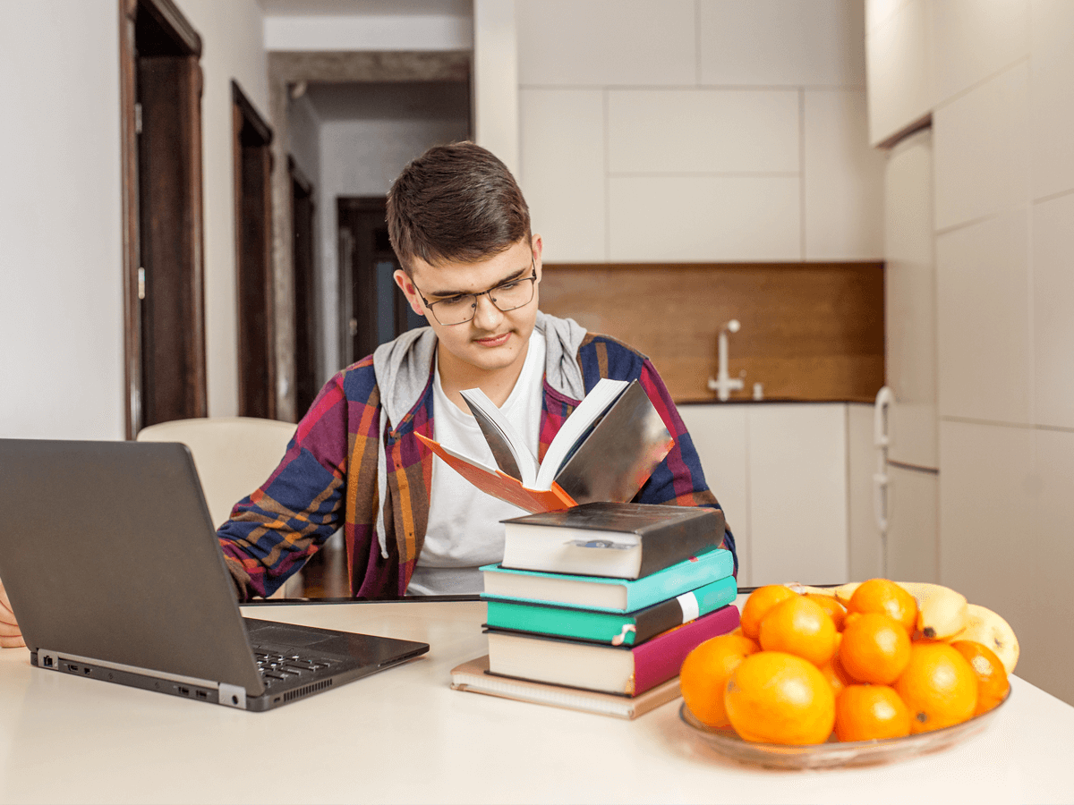 A student sits at a table with a laptop and a pile of books