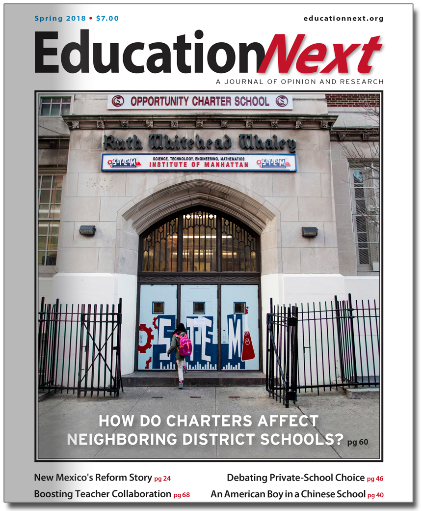 In the Spring 2018 issue cover story, we present evidence on the spillover effects of charter schools on nearby district-school students. New research finds that students attending a district school in New York City within a half-mile radius of a charter school score better in math and reading and enjoy an increase in their likelihood of advancing to the next grade. Benefits are even greater for district schools that share their buildings with charter schools.