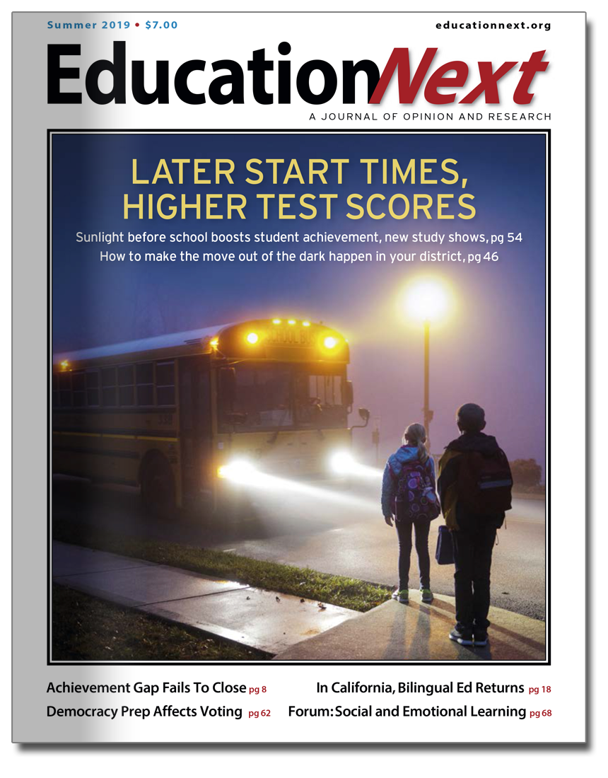 Link to Summer 2019 issue of EdNextThe cover stories of our Summer 2019 issue address the increasingly popular topic of delaying school start times. A new study presents the first findings to quantify the academic benefits of later start times for all students. A second article examines how three districts have successfully pushed back start times for high-schoolers.