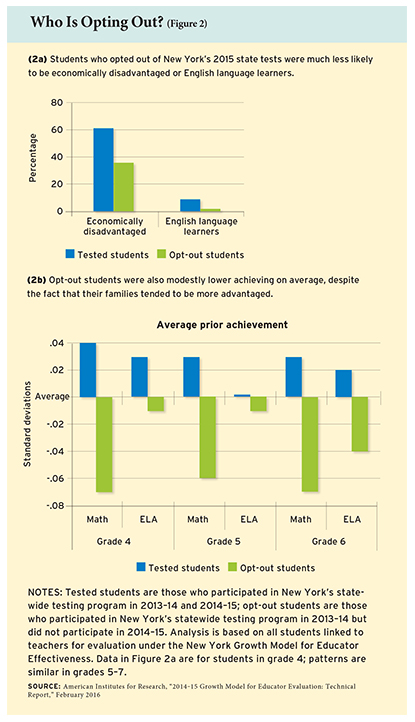 When we look further at these opt-outs, we find an interesting trend. Students who didn’t take the assessments in New York were more likely to be white, well off, and from upscale cities and towns (see Figure 2a). They were also modestly lower achieving than those who took the tests (see Figure 2b). In Washington State, the vast majority of those opting out were from economically advantaged households, and a high percentage were 11th graders. As they prepare for college, many 11th graders take the SAT or ACT and perhaps Advanced Placement exams as well, and they probably don’t relish the idea of also having to take state standardized tests.