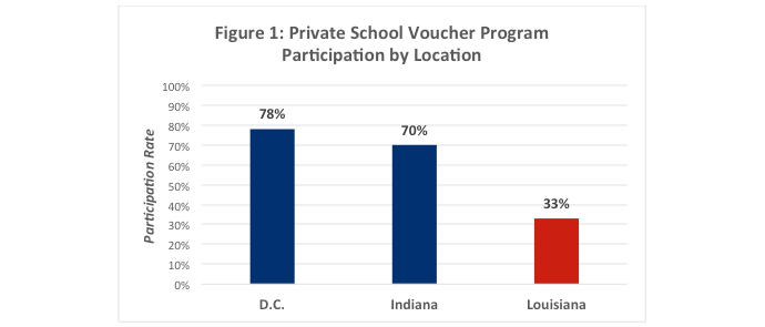 As shown in Figure 1 below, we observed that only a third of eligible private schools in the state decided to participate in the LSP, while between 70 and 78 percent participated in D.C. and Indiana. This follows intuition, as the regulatory costs are the highest in the LSP.
