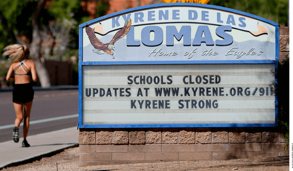 A runner passes a school closed sign Friday, April 24, 2020, in Phoenix.
