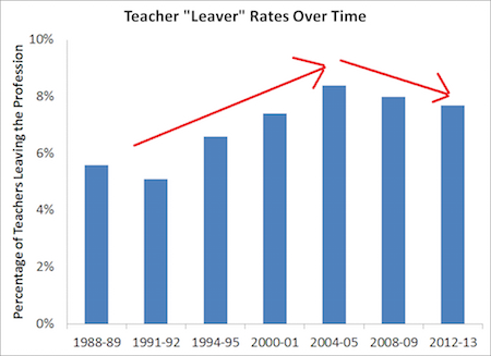 To understand how these trends are shaping the teacher workforce, let’s start with the overall national data. The graph below comes from a post I wrote last fall showing national, longitudinal data from the National Center for Education Statistics (NCES). It tracks the percentage of teachers in a given year who leave the profession. As the arrows show, there was a general upward trend through most of the 1990s and 2000s, but that trend has reversed in more recent years:
