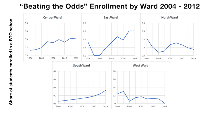 That’s a positive report for Newark. But those citywide results don’t tell the whole story. When we looked at the share of “beating the odds” enrollments within Newark’s five wards, it appears that some areas of the city do better than others. “Beating the odds” enrollments appeared to grow in the East, Central, and South wards between 2006 and 2012, and decline in the West and North Wards over the same period.