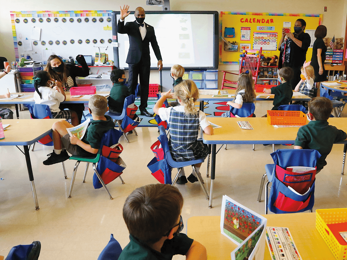 Superintendent Henderson Lewis Jr. stands in front of a class at Edward Hynes Charter School after the school resumed in-person learning in October 2020.