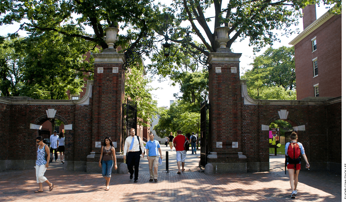 Students and faculty walking through a gate on a college campus.